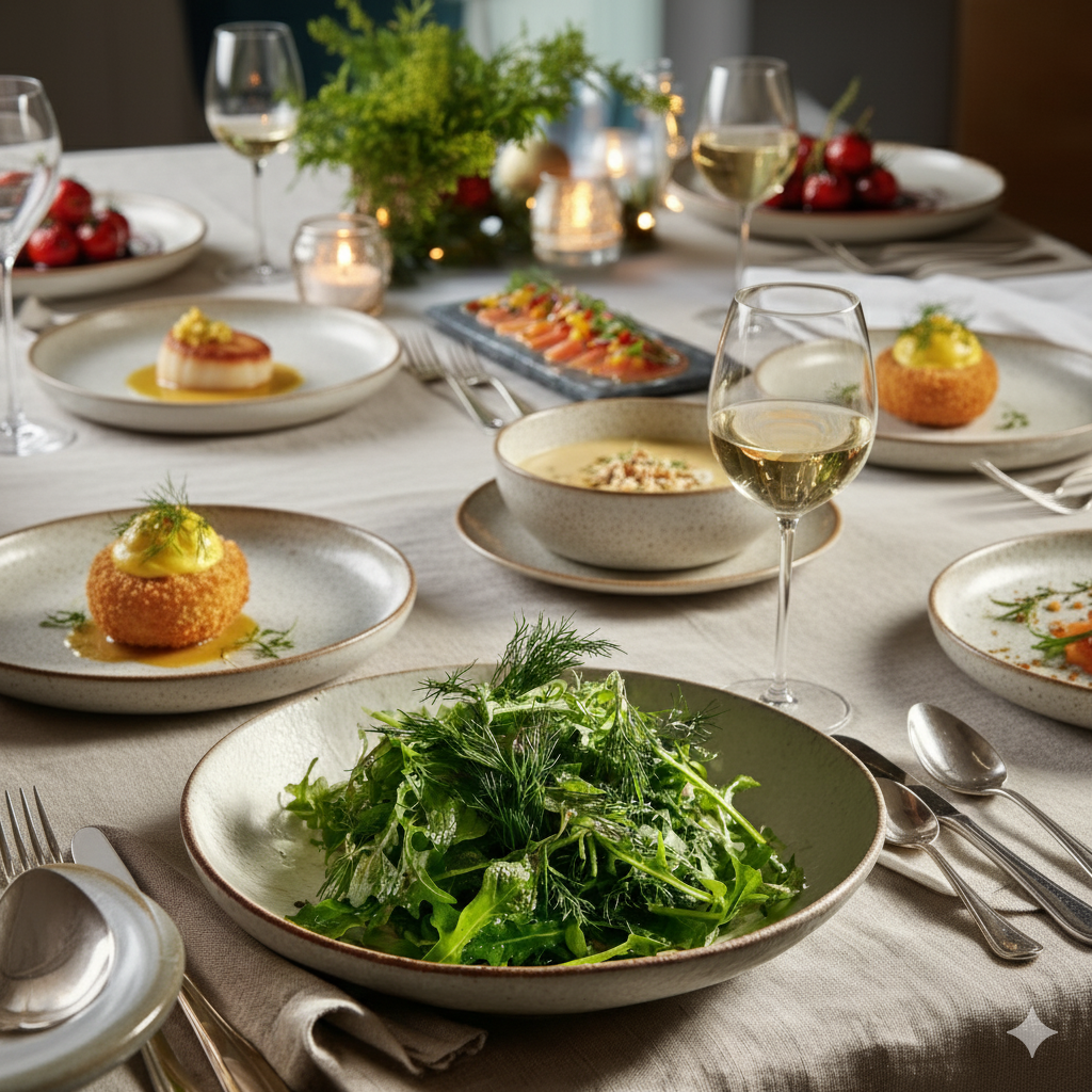 Dirty Mimosa et mayonnaise aux notes piquantes, Gravlax de saumon et vinaigrette au piment végétal, Fondant de pomme de terre, Tomates rôties laquées aux fruits rouges, Salade de roquette, menthe et aneth, et pour finir sur une note douce et surprenante, un Velouté de pomme épicé accompagné de son crumble aux noix de pécan. Des tapas revisitées qui promettent de surprendre vos papilles et d’offrir à ces bouchées conviviales une élégance nouvelle, chic et gourmande.
